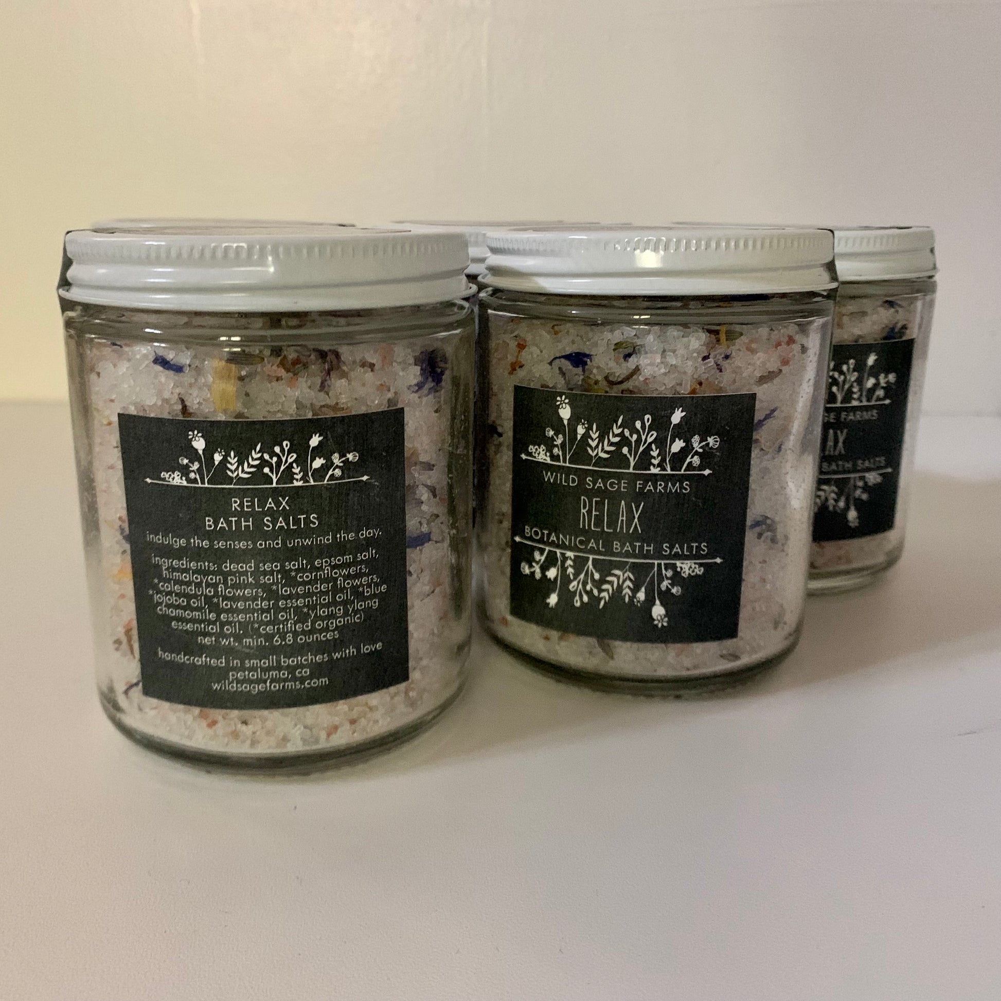 Ingredients: Dead Sea salt, epsom salt, Himalayan pink salt, *cornflowers, *calendula flowers, *lavender flowers, *jojoba oil, *lavender essential oil, *blue chamomile essential oil, *ylang ylang essential oil. (*certified organic ingredient)